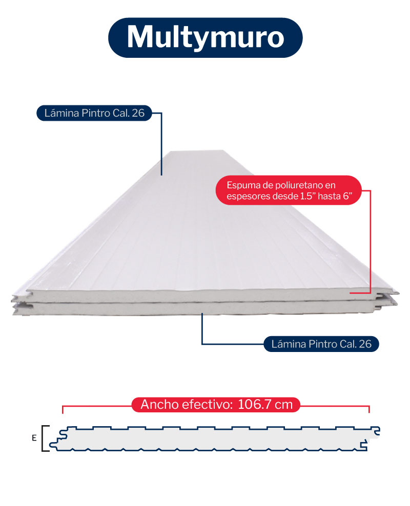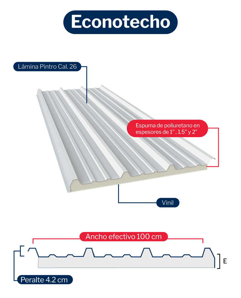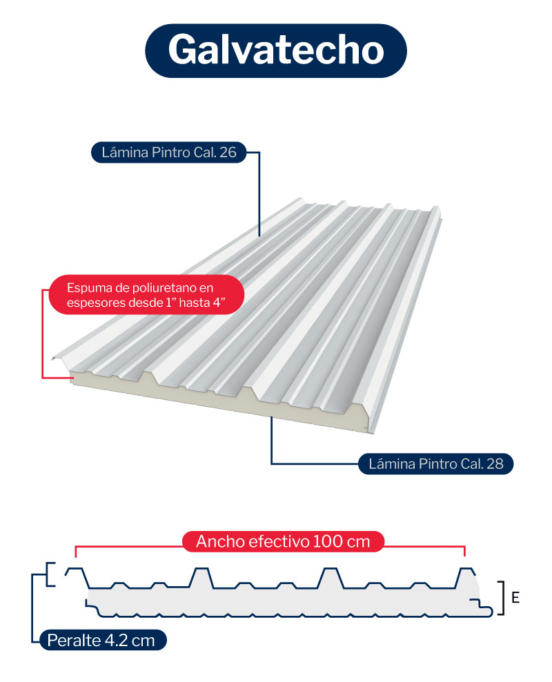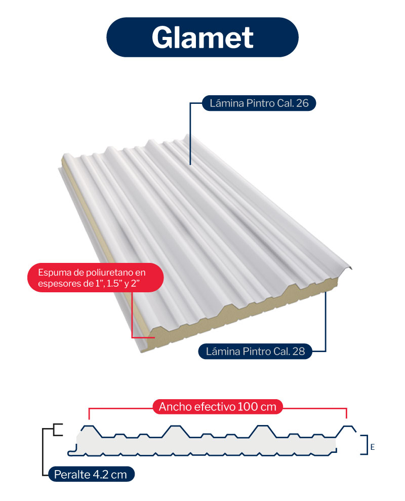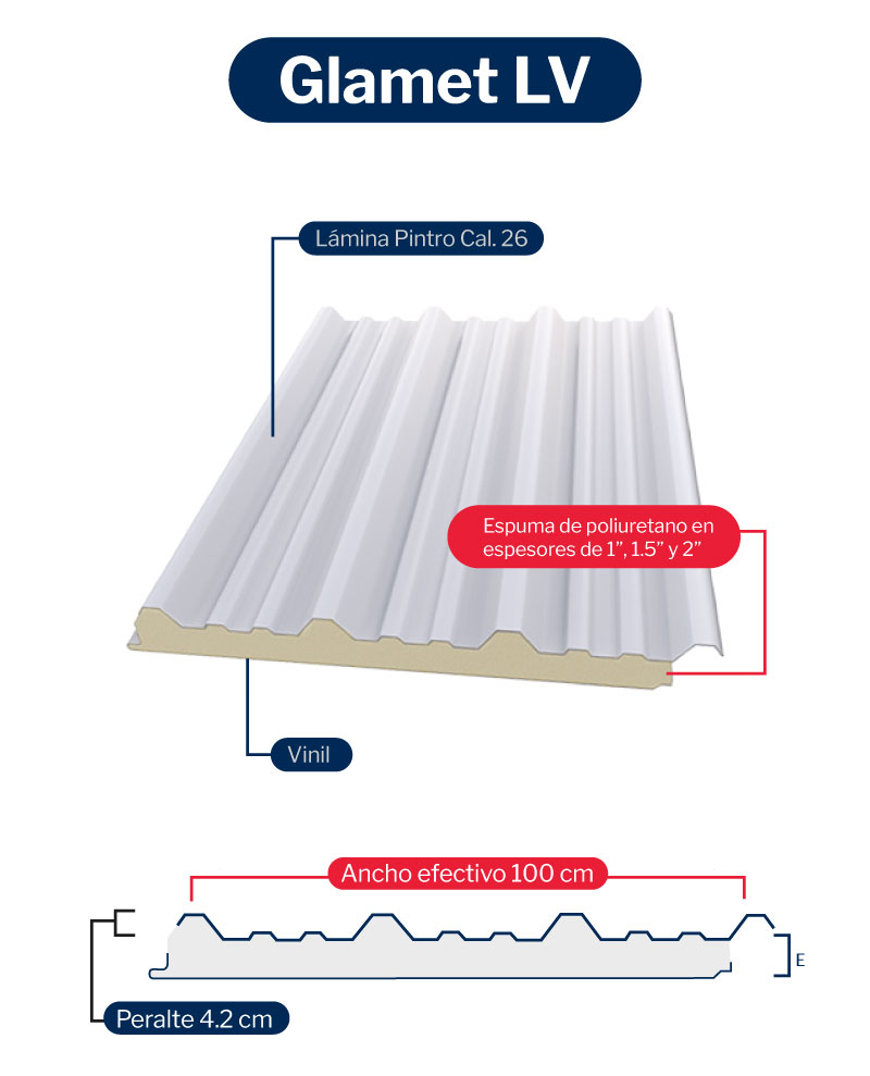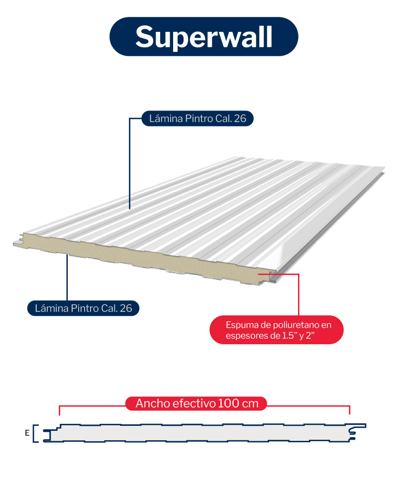 Una cara de lámina de acero galvanizado prepintado y otra de vinil, además de un centro de espuma rígida de poliuretano.